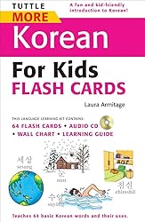 - A fun and kid-friendly introduction to Korean! The Tuttle MORE Korean for Kids Flash Cards kit is an introductory Korean language learning tool especially designed to help children from preschool through early elementary level acquire basic words, hangul script, phrases, and sentences in Korean in a fun and easy way. The flashcards can be used as a learning tool in a classroom setting, at home, or anywhere that learning takes place, and can easily be taped around the room for an interactive way to learn Korean. The set contains a total of 64 words organized into thematic categories, including: Animals, At My House, Things I Like to Do, Actions, Opposites, Weather, and Nature. All of the words are illustrated—the pictures serve as effective visual aids to help children learn and remember each word's meaning. Words often reflect cultural objects and items and can be studied in any order. Learners may focus on one theme at a time or mix them up for a little more variety. Also included in this kit is an audio CD which provides native pronunciation of the words, and sample sentences for practice—sentences that children would use in everyday life. Songs and other activities are also included on the free audio CD. Finally, the kit also includes a wall chart featuring the front of each card for kids to review and a learning guide for teachers and/or parents with tips, activities and more! If your child is really interested in learning more words, and you missed the first kit, check out the Tuttle Korean for Kids Flash Cards kit (978-0-8048-4009-5).