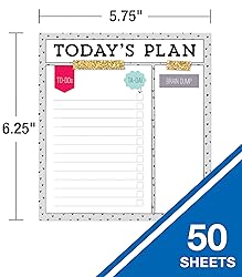 • Organize your notes, to-do list, and more with a daily planner notepad using Carson Dellosa’s stylish Today’s Plan Notepad. The planner pad features 50 sheets of lined paper that say "Today's Plan" with a to do list section, a ta-da checklist box, and brain dump organizer—perfect for teacher gifts, classroom essentials, or an everyday to do notepad. Measuring 5.75” x 6.25", the to do list notepad is a great tool for home office organization, school supplies for college students, and other stationery needs. Use the note pad as a project organizer and homework organizer, create lists, jot down meeting notes, use as a small sketch pad, and more.