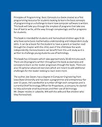 - Principles of Programming: Basic Concepts is a first programming resource for students and homeschoolers wanting an introduction to programming. This book will take you through the simplest of programs all the way through complex logic in ten easy lessons. 10 easy lessons each with key concepts important to programming 26 practice programs to be written by the student 16 advanced exercises for extra instruction and challenge download all the code to create each program This book is intended for students and homeschool children ages 9-16 who have some basic mathematics understanding and independent study skills. It's a standalone curriculum or unit study on programming basics. Each lesson takes approximately 30-60 minutes to complete depending on skill level. It can be a boost for the student to have a parent or teacher read through the chapter with the child, even if the child does the work independently. Homeschoolers can benefit from this unit study as it is written to challenge young students use of technology. The basic concepts presented in the book center around using Small Basic as a programming language. Small Basic is a simplistic language great for learning entry level programming skills. The concepts in the book are central to programming the easiest of programs all the way through complex programming systems. Using Small Basic, combined with these basic programming concepts, the beginner programmer can quickly learn to program computers and gain the basics of programming.