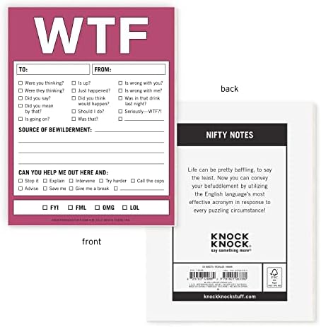 Spell out your befuddlement in the midst of any circumstance (while also channeling pent-up frustration) with the English-speaking world's most expressive acronym and the simple check of a box or two. It's the ultimate FYI. Never be at a loss for words again with the WTF Nifty Note from Knock Knock! Favorite office gift for coworkers, or funny notepad gifts for adults, and family members or friends. Includes: one (1) notepad 4 x 5.25 inches, 50 sheets each. Knock Knock is an independent maker of clever gifts, books, and whatever else we can think up. Our mission is to bring humor, creativity, and smarts to everyday life. Put the fun in functional with Knock Knock stuff.