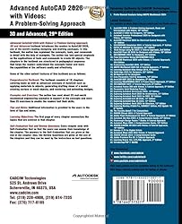 - The Advanced AutoCAD 2026 with Videos: A Problem-Solving Approach, 3D and Advanced book contains detailed explanation of AutoCAD commands and their applications to solve design problems. Every AutoCAD command is thoroughly explained with the help of examples and illustrations. This makes it easy for the users to understand the functions and applications of the tools and commands. After reading this book, you will be able to create 3D objects, apply materials to objects, generate drafting views of a model, create surface or mesh objects, and render and animate designs, and understand 3D Printing. This book covers designing concepts in detail as well as provides elaborative description of technical drawing in AutoCAD including orthographic projections, dimensioning principles, sectioning, auxiliary views, and assembly drawings. While going through this book, you will discover some new unique applications of AutoCAD that will have a significant effect on your drawings and designs. The book also covers the 3D printing tools introduced in AutoCAD.Salient Features:Comprehensive textbook consisting of 19 chapters organized in a pedagogical sequence.Detailed explanation of all commands and tools.The first page of every chapter summarizes the topics that are covered in it.Step-by-step instructions to guide the users through the learning process.Additional information throughout the book in the form of notes and tips.Self-Evaluation Tests and Review Questions at the end of the chapters to help the users assess their knowledge.Table of Contents Chapter 1: Adding Constraints to Sketches Chapter 2: Understanding External References Chapter 3: Working with Advanced Drawing Options Chapter 4: Grouping and Advanced Editing of Sketched Objects Chapter 5: Working with Data Exchange & Object Linking and Embedding Chapter 6: The User Coordinate System Chapter 7: Getting Started with 3D Chapter 8: Creating Solid Models Chapter 9: Editing 3D Objects-I Chapter 10: Editing 3D Objects-II Chapter 11: Surface Modeling Chapter 12: Mesh Modeling Chapter 13: Rendering and Animating Designs Chapter 14: Hyperlinks and 3D Printing Chapter 15: Script Files and Slide Shows Chapter 16: Creating Linetypes and Hatch Patterns Chapter 17: Customizing the acad.pgp File Chapter 18: Conventional Dimensioning and Projection Theory Using AutoCAD Chapter 19: Isometric Drawings Student Projects (For free download) Index Free Teaching and Learning Resources:CADCIM Technologies provides the following free teaching and learning resources with this book:Technical support by contacting [email protected] files used in tutorials, exercises*, and illustrationsInstructor Guide with solution to all review questions and instructions to create the models for exercises*Additional learning resources at https://allaboutcadcam.blogspot.com (*For faculty only)About the Authors: CADCIM Technologies, Prof. Sham Tickoo of Purdue University Northwest, and the team of dedicated contributing authors at CADCIM Technologies are committed to bring you the best textbooks, eBooks and free teaching and learning resources on CAD/CAM/CAE, Civil/GIS, Animation & VFX, and related technologies. We strive to be the first and the best. That is our promise and our goal.All our books have been structured in a way that facilitates teaching and learning, and also exposes students to real-world applications. The textbooks, apart from providing comprehensive study material, are well appreciated for the simplicity of content, clarity of style, and the in-depth coverage of the subject.