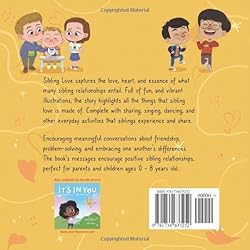 - Celebrate Sibling Relationships with this Picture BookSibling Love captures theups and downsof what many sibling relationships entail. Full of fun, and vibrant illustrations, the messages highlights all the things that sibling love is made of; complete with sharing, singing, dancing, and everyday activities that siblings experience and share. Inside you'll find a diverse group of siblings of different races and gender. Siblings are often our very first friends and it's the way children learn to handle relationships, closeness, give support, and resolve conflicts. This book will encourage important conversations about:SharingFriendship Problem solvingPositive Sibling RelationshipsAccepting each others differences Perfect for all sibling relationships. Baby-8 years old.