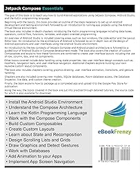 - The goal of this book is to teach you the skills necessary to build Android applications using Jetpack Compose, Android Studio, and the Kotlin programming language.Beginning with the basics, this book explains how to set up an Android Studio development environment.The book also includes in-depth chapters introducing the Kotlin programming language including data types, operators, control flow, functions, lambdas, and object-oriented programming.An introduction to the key concepts of Jetpack Compose and Android project architecture is followed by a guided tour of Android Studio in Compose development mode. The book also covers the creation of custom Composables and explains how these functions are combined to create user interface layouts including the use of row, column, box, and list components.Other topics covered include data handling using state properties, key user interface design concepts such as modifiers, navigation bars, and user interface navigation. Additional chapters explore building your own re-usable custom layout components.The book also includes chapters covering graphics drawing, user interface animation, transitions, and gesture handling.Chapters are also included covering view models, SQLite databases, Room database access, the Database Inspector, live data, and custom theme creation.Finally, the book explains how to package up a completed app and upload it to the Google Play Store for publication.Along the way, the topics covered in the book are put into practice through detailed tutorials, the source code for which is also available for download.