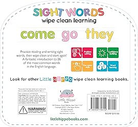 - Practice reading and writing sight words, then wipe clean and start again! A fantastic introduction to 26 of the most common words in the English language.Learn the definitions of the most popular sight wordsLetters have directional arrows illustrating how to write themWord exercises include using the learned word in a sentence, circling the rhyming words, identifying the sight wordSee, trace and draw feature shows how to write the word and gives you room to practiceEach page in the board book has a wipe clean surfaceWipe clean educational book encourages repetition for increased learningPen is includedBe sure to check out the other titles in our Wipe Clean collection: Pen Control, ABC and 123Whether you're looking for well-known tales, tender or funny animal stories, or educational books for toddlers, Little Hippo® board books will become bedtime, or anytime, reading favorites!Board Book26 Pages9.5 inches x 8.625 inchesAges 3 to 6