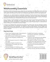 - Unleash the Speed: Master WebAssembly and Take Your Web Apps to the Next LevelThrough practical examples, you’ll learn how WebAssembly can transform C++, Rust, and other languages into lightning-fast web apps. Step-by-step, you’ll master techniques to integrate WebAssembly modules into JavaScript projects for seamless communication.You’ll discover strategies to optimize code, leverage multi-threading, and apply cutting-edge methods like lazy loading. We also tackle memory management and dive into profiling, benchmarking, and browser tools to push performance to the limits.This isn’t just essentials of webassembly - it’s a roadmap to learn intricacies, best practices, and solutions to common pitfalls. The goal is to equip you with the expertise to develop insanely fast applications. The future is native-level performance on the web. Join the revolution and skill up with this essential edition to mastering WebAssembly. Your web apps will never be the same!Key LearningsGrasp WASMs core concepts, bridging web and native apps, boosting performance seamlessly.Dive into tools like Emscripten and Binaryen, facilitating efficient cross language compilations to Wasm.Learn techniques to convert C++, Python, and Java apps, unlocking web application potential.Seamlessly integrate JavaScript and WebAssembly, ensuring smooth inter-module communications.Harness strategies for fine-tuning code, guaranteeing peak application performance.Explore multi-threading, leveraging simultaneous operations, accelerating execution times.Implement lazy loading and code splitting, optimizing web app responsiveness and load times.Dive deep into efficient memory usage, ensuring resourceful application execution.Proficiently use browser developer tools, dissecting and enhancing application performance.Enhance user experience with effective caching, ensuring rapid web application accessibilityPrerequisitesThis book is for every programmer aspiring to put their all applications onto web browser with the same speed, efficiency and product performance. Knowing fundamentals of any programming language and basics of web app development is sufficient to tear out the book wholly.