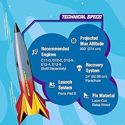 ADVANCED MODEL-ROCKET-BUILDING KIT: This kit allows ages 10+ and advanced rocket-building enthusiasts to create our powerful 2162 Big Daddy rocket model for thrilling flights during summer and holiday breaks. It includes the rocket parts, design decals, a recovery parachute, and instructions. It requires rocket engines, Starters, Recovery Wadding, a launch pad system, a launch rod, and 6 high-quality 1.5-volt AA alkaline batteries for launch use (sold separately). SOARS UP TO 900 FT.: Our large 2162 Big Daddy model rocket features a 20-inch height, a 24-inch preassembled parachute, and a projected altitude of 900 ft. (274 m) using an E12-6 Estes rocket engine (sold separately). It is also compatible with C11-3, D12-3, D12-5, or E12-4 rocket engines. READY TO ASSEMBLE: Rocket-building kits are creative, educational gift ideas for Christmas or special-occasion surprises! Our advanced rocket kit presents a rewarding challenge that requires advanced building skills and 2+ hours of assembly time. Pair it with the Porta-Pad E Launch Pad, E Launch Controller, and 3/16-inch “Maxi” Launch Rod (sold separately) for a successful launch. SAFETY FIRST, FUN ALWAYS: Our rockets are designed to be used with the NAR (National Association of Rocketry) model-rocket safety code. Always ensure you have an appropriate launch site, stand back at least 15 ft., insert the safety key, issue a countdown, and then you can let your rocket fly! WE IGNITE IMAGINATIONS: Since 1958, Estes has created educational rocket kits designed for an unforgettable launch experience. As a family-owned company, we have grown to offer exciting STEM products that engage aspiring rocketeers and the future minds of aerospace. Flies up to 900 ft (274 m) Biggest blow molded noes cone in the hobby Redesigned to handel our super powerful E engines Kit features laser cut wood fins, waterslide decals, and 24-in (61-cm) Parachute Recovery Requires 3/16-in (5-mm) Maxi Launch Rod & launch controller (sold separately)