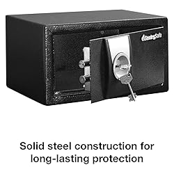 HOME SAFE: Ideal first safe for a college dorm room or apartment; Secure and rotect your valuables with this personal safe, complete with carpeted floor to prevent scratching to personal items KEY LOCK: Ensures protection for small valuables like cash, credit cards, photo IDs, and passports SECURITY: Key safe has two live-locking bolts, steel construction, pry-resistant door, and bolt down hardware to help prevent unauthorized entry or removal of your personal safe INCLUDES: Security safe comes with two keys and bolt down kit SPECIFICATIONS: Exterior: 6.6 in. H x 11.4 in. W x 10.4 in. D; Interior: 6.4 in. H x 11.3 in. W x 8.4 in. D; small key lock safe