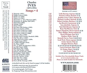 - Charles Ives wrote almost two hundred songs. Although his reputation rests on orchestral, chamber and piano music, it is Ives's songs that represent the heart of his creative thinking. The expressive variety encountered is accordingly vast: indeed, the gradual evolution of Ives's songwriting is analogous to the wider evolution of American music during the late nineteenth and early twentieth centuries. This new edition includes all the songs that Ives completed. The alphabetic approach ensures that each volume (of which this disc is the fourth of six) contains a representative cross-section.