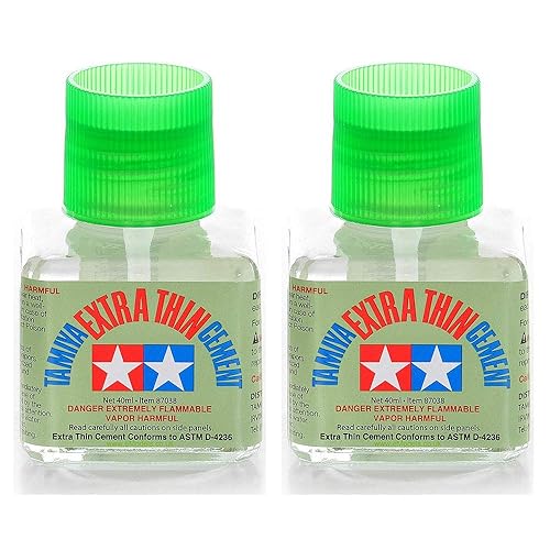 - This adhesive is ideal for constructing plastic (styrene) models. It arrives in a steady hexagonal bottle, 47mm in height, containing 20ml. A brush for application is conveniently located on the cap's reverse side. It takes 1-2 minutes to set and fully cures within 24 hours.