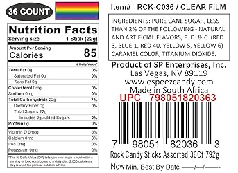 - Espeez Rock Candy SticksMade with only the highest-quality ingredients, Espeez Rock Candy on a Stick is a classic adult and kid-friendly treat. One of the most popular old-fashioned candies, they are perfect as party favors or decorations for your:Candy BuffetBirthday PartyAnniversaryBridal ShowerWedding ReceptionSpa PartyPool Party (Try in mixed drinks and cocktails!)Graduation PartyColor Themed PartyIt’s a Boy or It’s a Girl Baby Shower (Gender Reveal Party)Elsa or Frozen PartyPrincess PartyGet creative with rock candy in white, blue, light blue, light green, red, pink, and purple for your holiday celebrations on Halloween, Valentine's Day, Saint Patrick's Day, Easter, Veteran's Day, Armed Forces Day, President's Day, Memorial Day, Independence Day, Election Day, Thanksgiving, Christmas, Hanukkah, and New Year’s Eve.Brand: EspeezTub Includes: 36 individually wrapped Assorted Rock Candy Crystal Sticks in grape, cherry, strawberry, watermelon, blue raspberry, cotton candy, and white sugar flavors. Each stick is 6.5 inches with 5” of crystal candy.Dimensions and weight of the tub: Diameter: 6.9 inchesHeight: 7.9 inchesWeight: 1 lb 12 ozIngredients: Pure cane sugar, less than 2% of the following - Natural and artificial flavors, F. D. & C. (Red 3, Blue 1, Red 40, Yellow 5, Yellow 6) Caramel color, Titanium DioxideOn sale for a limited time only. Click Add to Cart now!