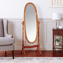 • This oak finish cheval mirror tilts to provide various viewing angles. Spindle legs and curved feet offer traditional styling.