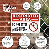 DURABLE ALUMINUM: 'Restricted Area Do Not Enter' signs are made from heavy-duty 40 mil thick aluminum. Unlike steel signs, our aluminum signs do not rust. Signs easily last up to 7 years outside. EASY INSTALLATION: Signs have four 3/16 inch corner holes. Mount with screws, nails, tie-wraps or wires. Signs can also be attached with foam or double-sided velcro tape. Sign attachment accessories are not included. LAMINATED PROTECTION: With lamination, graphics are protected from weather and abuse to preserve a fresh look. Graffiti can be cleaned off too. Clear UV laminate resists chemicals, UV rays, water, and abrasion. OSHA COMPLIANCE: Safeguard your workplace from accidents and liabilities by placing our high-quality signs that follow OSHA regulations. These are universally recognizable and encourage safe work practices. PACK CONTENTS: One 10 x 14 inch red, black and white aluminum sign.
