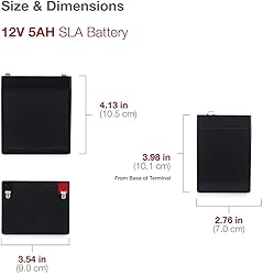 Replaces UPG # D5741 UB1250 12V 5Ah. Pack of 2 Dimensions: 3.54 inches x 2.76 inches x 4.21 inches. Weight: 3.09 Lbs SLA/AGM maintenance free, spill proof battery Rechargeable battery that can be mounted in any position, resists shocks and vibration BATTERY LIFE EXPECTANCY The overall life expectancy depends on the battery’s application, frequency of usage, temperature and discharge cycles. The number of discharge/charge cycles that can be reached by a battery depends on the depth of discharge and operating temperature. Lifetimes of 500-1200 cycles are most common. SLA batteries used in stand-by applications such as alarm systems tend to last longer.