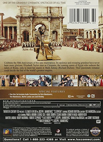 Celebrate the 50th Anniversary of this epic spectacle it's opulence and sweeping grandeur have never been more glorious. Elizabeth Taylor stars as Cleopatra, the glamorous and cunning queen of Egypt. To secure her hold on power, she seduces the rulers of Rome, only to meet her match in Mark Antony, played by Richard Burton. Their passionate romance could decide the fate of the world's greatest empires.