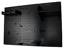 - The Wall Control Pegboard Standard Workbench Tool Storage Organizer Kit offers maximum tool board storage versatility and strength with over 10.5 square feet of pegboard storage space. Three 16in x 32in Black powder-coated pegboard panels combine for a total tool storage area of 48in x 32in which will accommodate many pegboard hooks. The attractive Metal Pegboards are great for heavy duty tool board storage needs due to their 20 gauge steel construction that will not warp, fray, or crack and are over 10 times stronger than conventional pegboard creating an industrial grade tool storage solution that will last a lifetime. Wall Control metal pegboards offer both slots and holes to accept slotted tool board accessories as well as conventional 1/4in peg board hooks making this pegboard extremely versatile by giving the user multiple options with tool board accessory selection. The patented engagement of the slotted tool board hooks included improves hook security for more hassle free tool storage. These versatile, durable, and high strength metal pegboard panels are an easy-to-use tool storage solution for any garage, shop, or tool crib. The metal pegboard panels are easy to install into studs or flat surfaces with pre-drilled mounting holes on 16in centers. A built-in frame return flange provides ample hook clearance and full access to all holes without requiring additional framework or using up pegboard holes for mounting. Mounting hardware is also included. Wall Control Pegboard Products are Made in the USA. The Metal Pegboard Standard Workbench Organizer Kit Includes: (3) Black Powder-Coated Metal Pegboard Panels 32 in. x 16 in. (Covers 48 in. x 32 in. when Installed), (1) 9 in. Shelf Assembly, (1) 6 in. Shelf Assembly, (3) Plastic Hanging Bins with Bin Hanger, (1) Screwdriver Holder, (1) Hammer Holder, Assortment of (20) Additional Hooks and Brackets. Mounting Hardware is Included. Black Pegboards with Black Tool board Accessories. Tools and Tool Sets Not Included.