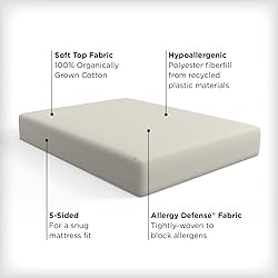COTTON TOP COVER: is made from one hundred percent organically grown cotton 6 OUNCE PLUSH FIBER FILL: made from recycled plastic materials WATERPROOF: protective TPU layer sits beneath the top fabric to defend against everyday spills and stains ALLERGY DEFENSE FABRIC: tightly-woven construction blocks unhealthy household allergens – including dust mites, pollen, and pet dander – from passing through the fabric and collecting in your mattress FITTED POLYESTER SIDEWALLS: corners stretch to accommodate twin and full mattresses up to 15 inches deep and queen and king mattresses up to 17 inches deep EASY CARE INSTRUCTIONS: machine wash warm, with nonchlorine bleach when needed. Tumble dry on lowest setting separately to avoid protector damage. Dryer temps vary by brand, use the lowest setting and remove when dry. Do not iron. LIFETIME WARRANTY: for peace of mind that you’ve made a clean, healthy choice for you and your family!