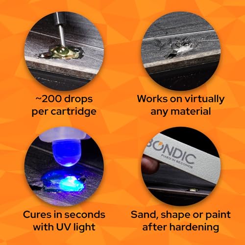 - BOND, BUILD, FIX AND FILL ALMOST ANYTHING: Use Bondic on plastic, wood, metal, PVC, steel, rubber, wiring, ceramic, figurines, vinyl, Kevlar, polypropylene, leather and so much more to fix ends of phone chargers, children's broken toys, jewelry, glasses, or your favorite pair of heels