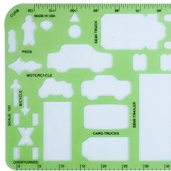 Vehicles and pedestrians are provided in two convenient scales. The symbols are conveniently grouped with vehicles and pedestrians on one template and miscellaneous symbols on the other. The ruler ratio is: 1 inch equals 20 feet and 1 inch equals 10 feet. Size is 4" X 8" each. Color is green.