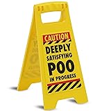 - Some moments deserve a warning. That post-coffee masterpiece. That spicy dinner aftermath. That silent-but-deadly achievement. Whatever the case, the Satisfying Poo Warning Sign has your back. This reversible desk-style sign lets everyone know what they’re walking into—before it’s too late. One side gives a friendly heads-up, while the other delivers a clear evacuation notice. Whether you keep it by the bathroom door, on your desk, or as a funny bathroom sign for guests, this little piece of genius is here to protect the innocent. Perfect as a funny gift for husbands, a novelty gift for dads, or a white elephant gift that gets everyone laughing, this sign is a must-have for anyone who takes pride in their work. Ideal for birthdays, Father’s Day, or just because—because sometimes, words aren’t enough. Size: 10 x 5 inches