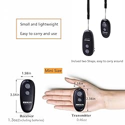 - Features: PHOLSY wireless shutter release remote control for Canon cameras; The transmitter can control the receiver wirelessly to perform autofocus, single shot, delayed release of 3s and continuous release (BULB); The receiver can also be used as a wired shutter remote to do autofocus, single shot, continuous release(bulb). Transmission distance: 2.4GHz 80m+ (open space without interference) Dimension: Transmitter: L 67mm X W 36mm X H 13mm; receiver: L 90mm X W 41mm X H 32mm Weight: Transmitter: 13g; receiver: 37g excluding batteries Cable length: Not stretched 19.5 inches / 50 cm; stretches to approximately max 59 inches / 150 cm Box Contains: 1 X PHOLSY wireless shutter remote release control transmitter 1 X PHOLSY wireless shutter remote release control receiver 2 X Connecting cord cable C6 and C8 1 X CR 2032 Battery for transmitter 2 X Lanyard sling 1 X Instruction manual