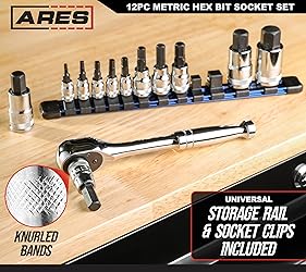 - Metric Sockets For Nearly Any JobThe ARES Metric Hex Bit Socket Set includes twelve hex bit sockets to help you accomplish a wide variety of tasks. The sockets are made of heat treated Chrome Vanadium steel and feature knurling for enhanced grip. The hex bit ends are made of premium S2 steel and their precise CNC machining ensures accurate size and fit, so they insert smoothly into fasteners, protecting both fasteners and bits from damaged edges. With the bonus universal aluminum storage rail, you can choose how you keep your hex bit sockets organized and save space in your tool box! Â Features: Â Includes: 12 pc. Metric hex bit sockets, 1 pc. storage rail, and 12 pc. storage clips1/4-inch drive: 3mm, 4mm, 5mm, 5.5mm, and 6mm hex bit sockets3/8-inch drive: 7mm, 8mm, 9mm, and 10mm hex bit sockets1/2-inch drive: 12mm, 14mm, and 17mm hex bit socketsSockets are made with Heat Treated Chrome Vanadium steelKnurling for enhanced gripCNC machined bits are high strength S2 steel Chamfered bit ends insert smoothly into fastenersUniversal storage rail constructed of aluminumStorage rail also compatible with ARES 70081, 70082, and 70083 socket clips