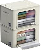 CLOSET STORAGE ORGANIZER SET - (2 Pack Beige) Store and protect clothing and household items with box style containers for organizing your bedroom. CLEAR WINDOW DESIGN - Features 2 clear windows to view contents at a glance with 2 strong zippered flap doors for protection - Metal wire frame sustains shape and avoids flattening contents, and can stand one of the other. EASY ACCESS & CLUTTER-free Organization and Storage - Front and top zipper opening makes it easy to store and remove contents - Secure carry handles allow for easy transport - Zips closed to protect contents from dust, pests, water damage, smells, moths, and more — Card holder allows for easy content labeling. STACKABLE & FOLDABLE, -SPACE SAVING - Sturdy frame stacks above and beneath additional organizers - Tucks away when not in use due to collapsible design - Store on shelves, in larger chests, closets, buffet hutches, garage, basement, attic, or under bed in home, office, dorm — Easy set-up: frame simply pops open into a large storage bins. MULTIPURPOSE - For seasonal clothing, bedding, blankets, comforters, linens, holiday decorations, books, toys, baby clothes, shoes, handbags, and more - Great for storing on shelving units, larger chests, closets, buffer hutches, basements, attics, garages, or under the bed - Made of 100% polyester - Measures approximately 19.75" L X 16" W X 13.75" H