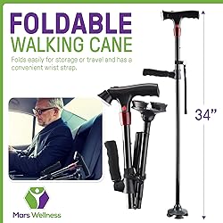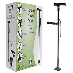 Illuminated Safety: Built-in LED light transforms this walking cane with light into your nighttime companion; bright flashlight illuminates your path in darkness; includes emergency alarm feature for added security Stability Design: Self-standing tripod cane with 3-prong base offers superior balance and stability; sturdy construction supports up to 300 lbs; provides reliable assistance for seniors, men and women with mobility challenges Portable Convenience: Collapsible cane folds quickly for easy storage; lightweight yet durable aluminum frame; perfect travel companion that fits in bags or vehicles; adjustable height accommodates users of all sizes Ergonomic Comfort: T-handle design reduces hand strain during extended use; walking cane for seniors features cushioned grip for comfort; stylish options available for both men and women who value both function and fashion Smart Features: Ready walker cane with light includes advanced technology; emergency button activates bright flashlight and alarm; stand secure walking cane provides independence and confidence for daily activities