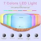 【Large Tank Diffuser】Large 500ml water capacity that can continue use up to 10 hours each time. 4 timers: 60/120/180/continuous modes, High/ Low modes as you choose. Enjoy life to the full and watch your mood improve. 【Mute Design Diffuser】 Deep Sleep , run steady and noiselessly(≤ 20dB), give you a quiet and comfortable room. 【Remote Control Aroma Diffuser】 Drop essential oils into aromatherapy diffusers, you can easily set up time, mist and light by this remote control on the bed, sofa and every corner in your room. 【Greatest Gift】Large tank, Easy to clean, BPA free, Mist mode and timer, and auto-switch to protect the device. Multi-functional Essential oil humidifier be built for family life. Your perfect gift. 【7 Atmosphere Lamp】 7-color cycle, 1-color fixed. You can choose to cycle them through, freeze on one fixed color and create a different atmosphere of interior space or turn the light off.