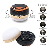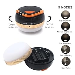 5 BRIGHTLESS LEVELS : High, Mid, Dim, SOS and Strobe allows this tent lights meet different requirements and can be used in versatile conditions. NEW Design :military grade material with latest water -resistance, heat-resistant, anti-shock ,Good quality LED bulbs(up to 100,000 hrs) and ABS+PC material ensures durability.promising a longer time use. BRILLIANT DESIGN :Pretty tinny and light weight but put out a enormous amount of light. This little overhead light does the job that a big bulky Lantern can do. STURDY FODABLE HOOK: The handheld floodlight is practical to hang in any location, illuminating the inside of tent, room nicely ,brightly, also easy to hang and carry. POWER SYSTEM: Powered by 3 AAA Batteries ( NOT Included)
