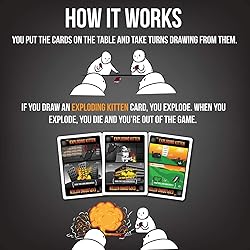Includes both the Adult version of Exploding Kittens (the most backed project in Kickstarter history) and the and First Expansion. Exploding Kittens is a card game for people who are into kittens and explosions and laser beams and sometimes goats. Exploding Kittens NSFW is an ADULT ONLY version of the game illustrated by The Oatmeal. The base game includes 56 cards (2.5 x 3.5 inches), box, and instructions, and the expansion includes 20 cards, box, instructions, and a human sized "Cone of Shame turn indicator When shuffled together, you can play with up to 6 players.