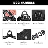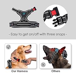[UPDATED VESION, EASY TO PUT ON & TAKE OFF] This dog harness has 3 buckles( One is on the neck with Lockable, two are on the chest), NO NEED go through dog’s head. This will let your dog loves to wear harness! [NO PULL WITH 2 HOOK LOOPS] There are 2 sturdy metal hook loops for leash attachment. If you use the front hook on the chest, it will reduce the pulling a lot and make going for a walk more enjoyable. As usual, most people like to use the back hook. [REFLECTIVE MATERIAL] The reflective material will be really nice when it gets dark. Also, your dog will be saw easily. This reflective material can make drivers have long time to react, which ensure your dog’s safety! [USEFUL & SOFT HANDLES] You will like this handle on the back,it is helpful in controlling dogs a bit closer to you when they are trying to lunge at something. Also, it is convenient to assist dogs into the car. [100% BEST CUSTOMER SERVICE] If any products quality really exits, a refund or replacement will be available.