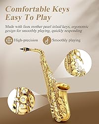 Beautiful Sound - professional tone adjustment before leaving factory, excellent sound quality without noise, pleasant surprise. No pressure from low to high gamut range transition. Top Material - instruments dedicated copper, lead-free welding green craft, feel free to use. Advanced imported leather pads, high air tightness, Imported blue copper needle spring, moderate elasticity, not aging, high feedback when finger pressing. Amazing look - Eastar AS -Ⅱ: Transparent lacquered gold, multi-layer painted,durable and barely to fade color. Faux mother of pearl inlaid keys are simple and generous. The handcrafted carvings of the bell mouth makes AS -Ⅱ perfect even more perfect Practical Design - Full bounding key stick gasket for longer life and better pressing feel. Keystroke link: all being applied oil for debugging before leaving the factory, preventing the link from rusting and getting stuck.Setting the F# key to suit the performance.The U-tube of the bass is adopted: Eastar has accumulated crafts experiences for many years to improve the stability of the bass and achieve a stable feeling of playing and resistance. Package Contents - Eastar AS -Ⅱ saxophone, Carrying Case,Mouthpiece Set, Real Leather Strap (110lb limit), Cork Grease,Shoulder Strap x 2,White Gloves, Resin Practice Reed x 1, Advanced Bulrush Reeds (Strength 2.5 ), Soft Swab, Soft Cloth, Cleaning Brush,Hard Saxophone Stand. Unique Serial-number for every Eastar AS -Ⅱ.12-Month Product Warranty.