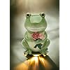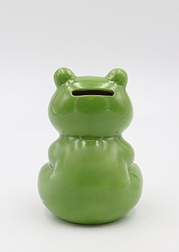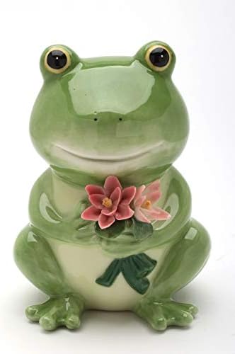Fine Porcelain Happy Green Frog Holding Pink Water Lily Flowers Money Piggy Bank Figurine, 5" H