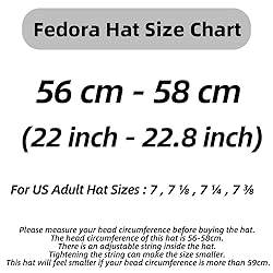 Strap Inside can be adjusted to fit head circumference from 56-58 cm (22 inch to 22.8 inch) ; It Fit for US Hat Size :7 , 7 1/8, 7 1/4 , 7 3/8 One size fits most men or women, It Will Look Great on Womens, Teenager as Well . It is light weight and Classic Style. Keep Head Warm in Cold Winter It is designed tear shape on top and folded short brim. It finished with non-removable band. Perfect for All Activities, Best choice for outdoor activities, such as Travel , beach, garden, fishing etc. Looks Cool. This Fedora Hat is Comfortable fit , Perfect Brilliant Accessory for special occasions and formal affairs like derbies, weddings, and proms . Conveniently match most outfit in all season for long
