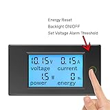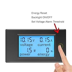 【4 in 1 multimeter】 This digital DC ammeter voltmeter is used to measure the voltage, current, energy and active power of electrical devices. 【Measuring range】 Voltage test range: DC 6.5~100V, current test range: 0~20A, active power test range: 0~2kW, energy test range: 0~9999kWh. Please DO NOT exceed the rated parameters. 20A are only for short loads, but not for continuous operation. We recommend you change to 50A version if you use with a continuous output more than 15A. 【More function】 Large LCD display with backlight; voltage alarm function; energy reset function; Data storage when power off; Built-in shunt,no need for external shunt. 【Wide application】 This DC volt amp meter is suitable for indoor use and cannot be used outdoors. It can be used to monitor the volt, amp, power and energy usage of battery, solar system, electric bicycle generator and other fields. The load cannot exceed the rated voltage and current. 【Package】 Package: 1*DC multimeter, 1*User Manual (English). Pay attention: Please connect according to the wiring diagram we provide. The wrong connection will cause the product to burn out or not work.