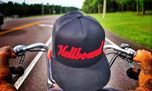 Hellbound Trucker Cap for Men – Flat Bill Mesh Snapback Hat – 5-Panel Black Cap with Bold Red Hellbound Front – One Size Adjustable – Cotton/Poly/Nylon Blend – Outdoor Summer Baseball Hat