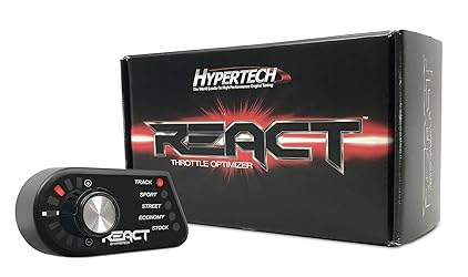 - REACT is Hypertech’s innovative new throttle optimizer which combines Hypertech’s history of award-winning Engineering and exciting performance. The REACT offers fully customizable control over your vehicle’s throttle response. The simple control knob allows you to switch between multiple modes and control the throttle intensity of each mode on-the-fly. The REACT installs easily and is completely plug-and-play, has an automatic setup sequence so no disassembly is required, comes with a magnetic A/C vent mount (Pedestal swivel mount also available - Sold separately), and doesn’t void your factory . Plus the REACT is internet updateable. Three (3) versions of the REACT throttle optimizer are available to fit your particular driving needs. . . Performance, Off-Road, and Tow. Once the installation is complete, the REACT Throttle Optimizer is ready to use. The REACT offers fully customizable control over your vehicle's throttle response. The simple control knob allows you to switch between multiple modes and control the intensity of each mode all on-the-fly. Pressing the knob clicks between each drive mode curve. Rotating the knob up increases the throttle intensity, while rotating the knob down decreases the throttle intensity. Your pedal position will need to be below a safe threshold for a new selection to take effect. (NOTE: Approx. 25% - Percentage varies with application. )