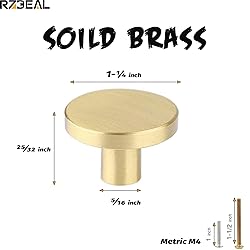 √ Great Solid Material:These round brass knobs are made of real solid brass,they are heavy weight knobs,with a substantial feel when you hold them in hands.These cabinet knobs are also sturdy and durable for daily use,provide long time service. √ Perfect Size:Width:1.26"(32mm);Height: 0.78"(20mm). There are 2 sizes(1.1inch&1.3inch) of knobs for you to choose,you can choose different sizes for your need.1.3 inch is large enough for fat fingers,and it can perfect fit for large size cupboard,it won't too small to grab. √ Superior Craftsmanship:They are round shaped knobs,without sharp edge,These gold knobs are a great choice for children's room to avoid hurting.Each knobs are carefully hand-polished with smooth surface,comfortable to hold. √ Ease of Installation:Included 2 different screws per knob to ensure fit for different furnitures.Easy to install and remove.2 Screw sizes:A-Metric Screw/M4x25mm,B:Metric Screw-M4x40mm. √ Strong Packing: All Knobs are well packaged individually in a bag,packed into the carton,it can effectively avoid scratches during shipping and ensure these knobs arrived in a good condition.