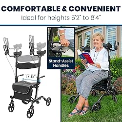 SUPPORTS WALKING UPRIGHT ON ANY SURFACE: The Vive Upright Walker is a superior alternative to ordinary walkers. It can help improve your posture and confidence. It can also help reduce pain in your neck, hips, knees, hands, and wrists. The upright rollator walker features 8”, flat-free wheels for greater stability on many surfaces, and its forearm pads adjust forward and backward, better accommodating different arm lengths. IDEAL FOR HEIGHTS 5'2" - 6'4": Locking push pins allow the height of the Vive upright rollator walker handles to be easily adjusted from 45” to 52” in height (ideal for heights 5'2" to 6'4"). The folding walker handles are topped with contoured armrests to evenly distribute pressure, relieving fatigue and length adjustable hand grips with easy to use loop brakes to lock the wheels in place for stable seating. COMFORTABLE ON THE GO SEATING: Featuring a supportive, 17.5” wide seat, the tall upright rollator walker provides comfortable, on-the-go seating for resting as needed. The folding rollator also includes a detachable shoulder bag that safely stores essential items close at hand. FOLDABLE DESIGN: Constructed with a durable aluminum frame, the Vive upright rollator walker is exceptionally durable, safely supporting up to 300 pounds. Easy to transport, the tall rollator walker folds for compact storage,fitting in the trunk of a car or even in the backseat. It weighs 20 pounds (a few pounds less than competitors). VIVE 1-YEAR GUARANTEE: Confident in its durability and safety, we offer a 1-year guarantee.