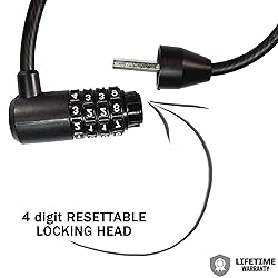 Cable Length = 5' ; Cable Width = 8mm.Note: Measure your door's backset, cross bore and thickness to ensure you find the right fit. Easy click locking, no need for keys when locking Resettable 4-digit combination to personalize your code ; Coilded and compact for easy transportation Combo Safe Program; Register your combination at kryptonitelock and we will be able to remind you what it is should you forget. Lifetime