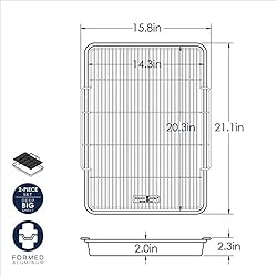 Great for making a variety of delicious treats like bacon, jerky, dried fruits, crisp fries, veggies and more Air crisp in your oven with this extra large oven crisp baking tray A healthier option to traditional frying, the pan catches drippings and the nonstick coated steel rack elevates food while the hot air circulates underneath so there's no need for turning foods Pan made of aluminum which conducts heat rapidly and evenly, resulting in beautifully browned foods no matter what’s on the menu with carbon steel rack and heat safe up to 400 degrees Made in America of domestic and imported materials and components. Extra large pan exterior including rack 21.1 x 15.8 x 2.3 inches, without rack pan measures 21 x 15 x 2 inches. Be sure to check your oven size as this is a large pan.
