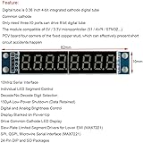 - Description: MAX7219 is an integrated serial input / output common-cathode display drivers, which connects the microprocessor and 8 bit 7-segment digital LED display, you can also connect a bar graph display or 64 separate LED. Includes an on-chip type B BCD encoders, multi-channel scanning loop, segment word driver, but also a 8x8 static RAM that stores each data. Only one external register is used to set the current of each LED segment. A convenient four-wire serial interface can connect all common microprocessor. Each data can be addressed in the update without rewriting all displays. MAX7219 also allows the user to select each data encoding or no coding. The entire device includes a 150μA low-power shutdown mode, analog and digital brightness control, a scan-limit register allows the user to display 1-8 bit data, there is an all LED light detection mode.Feature: Digital tube is 0.36 inch 4-bit integrated cathode digital tube Common cathode Only need three IO ports can drive 8 bit digital tube The module compatible of 5V / 3.3V microcontroller (51 / AVR / STM32...) PCV board four corners of the fixed copper stud, which can effectively precent short circuit accidents happen Wiring instructions (a program, for example, you can pick any IO port definition can be modified in the program): VCC to 5V, GND to GND, DIN to P00, CLK to P02, CS to P01Note: VCC and GND do not reversed, it would burn the chip. 51 MCU P0 port requires pull-up resistor, if your device does not have a pull-up resistor can be connected to other ports data lines.Package Including: 4 * MAX7219 8 bit digital display module