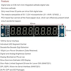 MAX7219 is an integrated serial input / output common-cathode display driver, which connects your microprocessor to a 7-segment digital LED display with 8 digits; MAX7219 digital display control module, you can use it for Ar-duino. The module is compatible of 5V / 3.3V microcontroller; Only three IO ports are used to drive the eight digit display. Only three IO ports are used to drive the eight digit display. MAX7219 supports flicker free displays as well as cascading displays; PCV board four corners of the fixed copper stud, which can effectively precent short circuit accidents happen. Wiring instructions (a program, for example, you can pick any IO port definition can be modified in the program): VCC to 5V, GND to GND, DIN to P00, CLK to P02, CS to P01; Digital tube is 0.36 inch 4-bit integrated cathode digital tube; Common cathode. Note:VCC and GND do not reversed, it would burn the chip.51 MCU P0 port requires pull-up resistor, if your device does not have a pull-up resistor can be connected to other ports data lines.