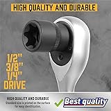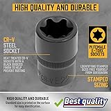 [HIGH QUALITY AND DURABLE] :Star socket is made of heavy-duty chrome vanadium steel and is phosphated to improve the adhesion and corrosion resistance of the coating. Standard size is printed on the surface for easy identification. [E-TORX SOCKET] :14-Piece Female E-Torx Sockets includes: 1/4" Drive: E4, E5, E6, E7, E8; 3/8” Drive: E10, E11, E12, E14, E16 1/2” Drive: E18, E20, E22, E24。 [WIDE RANGE OF USES] :E-Torx socket set can meet your work needs. It is an essential tool for your car, motorcycle, bicycle, lawn equipment, electrical appliances, machinery, etc. [EASY TO STORE] :Equipped with a dedicated storage box, and each position is marked with dimensions for easy storage. [AFTER SALE WARRANTY] :We provide high-quality products, lifetime warranty, rest assured to buy.