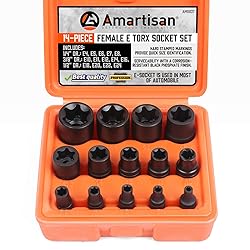 - [HIGH QUALITY AND DURABLE] :Star socket is made of heavy-duty chrome vanadium steel and is phosphated to improve the adhesion and corrosion resistance of the coating. Standard size is printed on the surface for easy identification.[WIDE RANGE OF USES] :E-Torx socket set can meet your work needs. It is an essential tool for your car, motorcycle, bicycle, lawn equipment, electrical appliances, machinery, etc.[EASY TO STORE] :Equipped with a dedicated storage box, and each position is marked with dimensions for easy storage.14-Piece Female E-Torx Sockets includes: 1/4" Drive: E4, E5, E6, E7, E8; 3/8” Drive: E10, E11, E12, E14, E16 1/2” Drive: E18, E20, E22, E24.