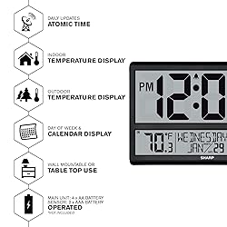 Sharp Atomic Clock - Never Needs Setting! –Easy to Read Numbers - Indoor/Outdoor Temperature, Wireless Outdoor Sensor - Battery Powered - Easy Set-Up (4" Numbers)