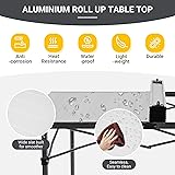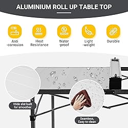 【Spacious Surface Design】Featuring a roomy 53.5" x 27.5" surface and upgraded height, aluminum camping table foldable comfortably seats 6-8 people – perfect for group meals, outdoor cooking stations, or organizing all your gear. Whether you’re grilling at a backyard BBQ or hosting a tailgate party, you’ll love having generous space for everyone and everything. 【Seamless Roll-Up Tabletop】Enjoy a smooth, gap-free surface with our upgraded wide aluminum slats - perfect for holding small items without them tipping or falling through. The premium aluminum top is not only waterproof and rust-resistant but also heat-tolerant, allowing you to safely place portable grills or camp stoves directly on camp table for outdoor cooking. Dirt and oil stains cannot be absorbed, allowing you to restore its shine with a simple wipe of a damp cloth. 【Easy to Set Up & Pack Down 】Featuring a one-action folding system with linked frame design, duck hunting camping table sets up and folds down in seconds - no tools or extra parts needed. Packs down to a lean 35 x 8.2 x 7 inches (smaller than most camping chairs). Lightweight aluminum construction and a divided carry bag make it a breeze to transport and store 【Built to Last】 Heavy duty roll up camping table is engineered for real outdoor adventures. You get a rock-solid steel frame and a tough yet lightweight aluminum desktop, all boosted by reinforced triangular hinges that easily hold up to 176 lbs (80kg). Corrosion-resistant coated steel tubing means this table withstands years of campfires, beach trips, and backyard BBQs without quitting on you 【Versatile for Any Outdoor Scene】 Folding camping table is the ultimate gear for duck hunting camps, fishing expeditions, tailgate party, beach picnics, and backyard BBQs. Equipped with anti-slip camping table leg tips, it remains stable on grass, sand, or rocky terrain, serving perfectly as an outdoor dining table or a heavy-duty work station