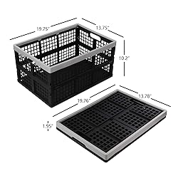 Size: open size: 19.75" x 13.75" x 10.2", folding size: 19.75" x 13.75" x 1.95", about 42 L Made of high quality plastic Collapsible and versatile design makes it portable and convenient to carry Folding storage basket can carry heavy items such as books, water bottles, bathroom supplies, papers and any other dense and compact items Suitable for moving, home storage, garage storage, shopping, in the pantry, trunk organizer and other purposes