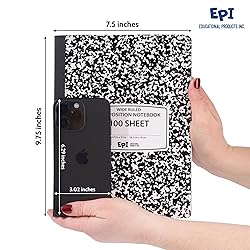 - Classic Composition Notebooks—Quality Construction for Durability & Convenience EPI's hardcover composition notebooks combine a timeless design with modern features to enhance your note taking experience. Ideal for multi-tasking students, teachers, professionals, or home users. This bulk pack provides ample writing space with 100 double-sided, wide ruled sheets (200 pages total) in each sturdy black marble notebook. Key Benefits: Durable sewn binding keeps pages securely attached Protective hardcovers with a classic black marble pattern Ruled format for neat handwriting & organization Useful reference charts & ruler printed inside covers Designated space for contact info, schedule & notes Measuring 9.75 x 7.5 inches, these notebooks are sized right to slip into a bag or backpack. Use the lined pages for jotting down school assignments, meeting notes, to-do lists, story drafts, recipes, journaling, drawing, and more. Teachers and school administrators appreciate the ability to stock up on an entire semester’s or year's worth of notebooks while saving time and budgets with a bulk pack. Families can keep everyone's notes and ideas organized with personalized notebooks for each member. Professionals like tackling projects, brainstorming sessions, and client meetings with confidence. Level up your note taking tools with EPI's reliable and sturdily designed marble composition notebooks. With a classic elegant style plus practical modern touches, they make staying organized easier than ever. Grab a value pack and be ready for anything.