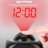 Digital Time Projection & Adjustable Angle: Easily project time onto walls or ceilings for clear visibility. Adjust the projection angle for great alignment, ideal for bedrooms or offices. Temperature Display & Voice Time Broadcast: Stay informed with built-in temperature display in both Celsius and Fahrenheit. Convenient voice feature announces the current time and temperature with the press of a button. Dual Alarm with Snooze Function: Set two separate alarms, for different schedules. Includes a one-button snooze for extra sleep, plus 5 alarm tones to wake you gently with 60dB volume. Compact Design: Black ABS construction ensures durability and modern style. Compact size (3.1 x 3.1 x 3.9 in) fits on any bedside table, making it a practical addition to your home or office. Dual Power Modes: Operates on 3 AAA batteries (not included) or via USB cable for continuous use. Ideal for use in different settings, whether at home or traveling.